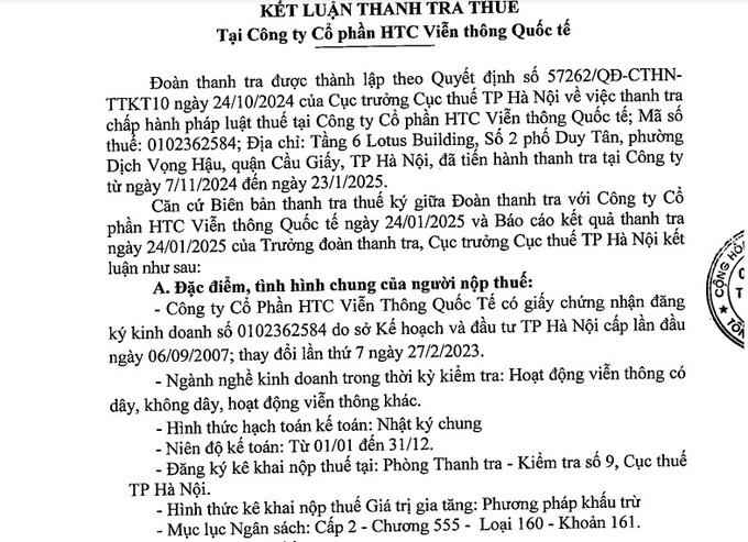 Cục Thuế Hà Nội vừa ban hành Kết luận thanh tra thuế đối với Công ty cổ phần HTC Viễn thông Quốc tế (HTC Viễn thông Quốc tế; địa chỉ: Tầng 6, Lotus Building, Số 2 Duy Tân, Cầu Giấy, Hà Nội).