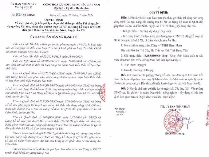 Ngày 26/7/2024, ông Đỗ Xuân Cương - Chủ tịch UBND xã Đặng Lễ ký quyết định số 355/QĐ – UBND phê duyệt kết quả đấu thầu Gói thầu: Thi công xây dựng công trình “Cải tạo, nâng cấp đường trục GTNT xã Đặng Lễ đoạn từ QL38 đến giáp thôn Lã Xá, xã Cẩm Ninh, huyện Ân Thi”. Công ty Thịnh Hưng trúng thầu với giá 19.685.050.000 VNĐ (giá gói thầu là 19.690.946.000 VNĐ), tiết kiệm cho ngân sách nhà nước 6 triệu đồng (tương đương 0,03%).