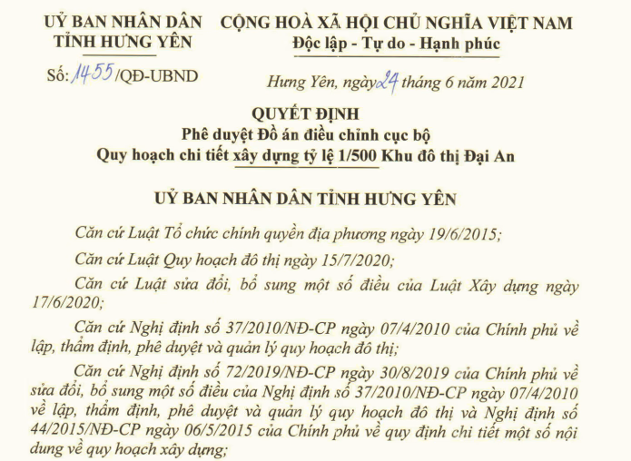 Theo UBND tỉnh Hưng Yên, nội dung điều chỉnh cục bộ quy hoạch chi tiết xây dựng tỷ lệ 1/500 Khu đô thị Đại An không làm thay đổi tính chất, quy mô và các giải pháp quy hoạch chính của đự án đã được phê duyệt trước đây.