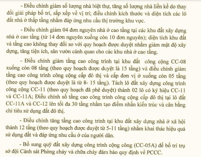 Bên cạnh đó, dự án cũng điều chỉnh giảm tầng cao công trình tại khu đất công cộng CC-8 xuống còn 18 tầng (theo quy hoạch được duyệt là 15 tầng) và điều chỉnh giảm tầng cao công trình công cộng cấp đô thị và cấp đơn vị ở xuống còn 5 tầng (theo quy hoạch được duyệt là từ 8 - 15 tầng). Tách lô đất xây dựng công trình công cộng CC-11 (theo quy hoạch đã phê duyệt) thành 2 lô có ký hiệu CC-11 và CC-11A.