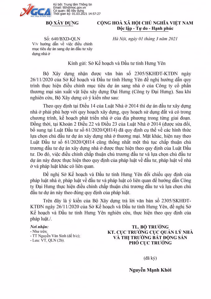 Bộ Xây dựng đề nghị Sở KH-ĐT tỉnh Hưng Yên đối chiếu quy định của pháp luật về nhà ở, pháp luật về đầu tư và pháp luật có liên quan để hướng dẫn Công ty Đại Hưng thực hiện điều chỉnh chấp thuận chủ trương đầu tư và lựa chọn chủ đầu tư dự án này theo đúng quy định pháp luật.