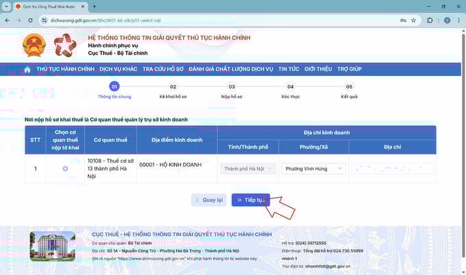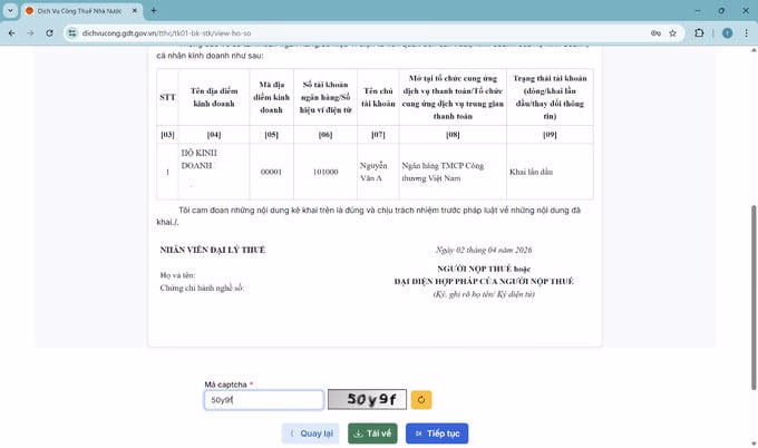 HKD, CNKD kiểm tra các thông tin đã kê khai và nhập mã captcha, sau đó chọn “Tiếp tục”.