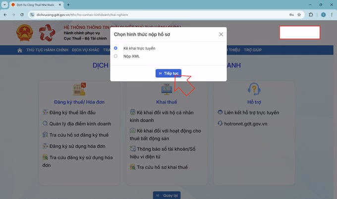 HKD, CNKD tích chọn "Kê khai trực tuyến" và nhấn "Tiếp tục"