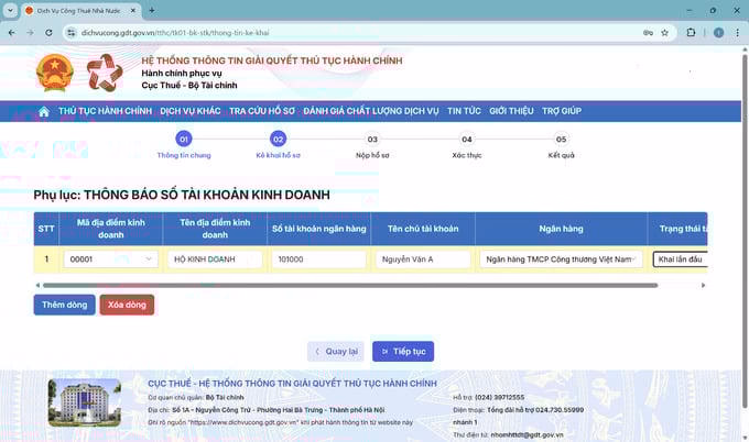 Bước 6: Hệ thống hiện phụ lục thông báo số tài khoản kinh doanh