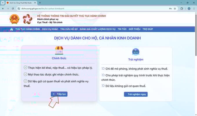 Màn hình tiếp theo hiển thị dịch vụ dành cho Hộ, cá nhân kinh doanh. Tại phiên bản chính thức, HKD, CNKD chọn "Tiếp tục"