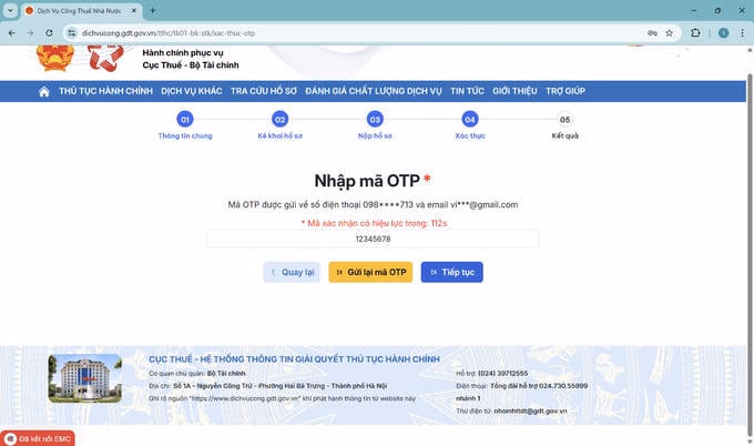 Bước 8: Hệ thống gửi mã OTP về số điện thoại và địa chỉ email của HKD, CNKD.
