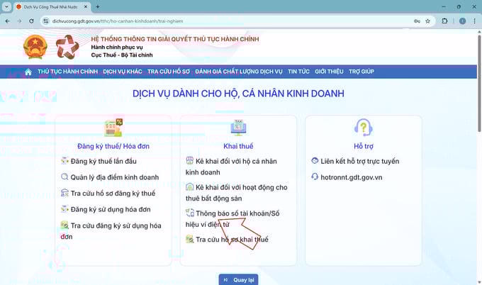Tại mục khai thuế, HKD, CNKD nhấn chọn "Thông báo số tài khoản/Số hiệu ví điện tử"