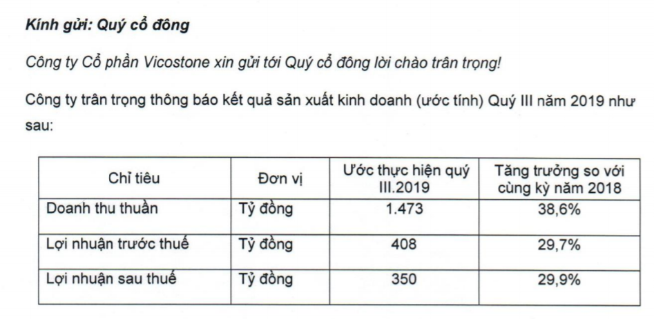Như vậy, sau 9 tháng đầu năm Vicostone ước đạt 3.999 tỷ đồng doanh thu thuần, tăng 24% so với thực kết quả 8 tháng đầu năm 2018. Lợi nhuận trước thuế và lợi nhuận sau thuế đạt lần lượt 1.191 tỷ đồng và 1.020 tỷ đồng, cùng tăng trưởng ở mức 29%.