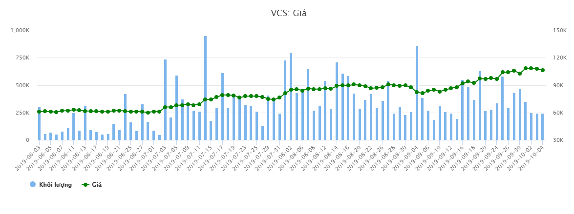 Tính đến phiên 29/3/2018, VCS đã thiết lập đỉnh tại mức giá 262.500 đồng/cp, tăng 4% so với đầu năm, vượt qua SAB và VCF, trở thành cổ phiếu có giá cao nhất trên thị trường chứng khoán Việt Nam.