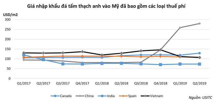 Do sự biến động của giá bán, từ tháng 9/2018, tỷ trọng nhập khẩu đá tấm thạch anh của Mỹ từ Trung Quốc giảm mạnh và đạt mức thấp nhất 0,14% vào tháng 7/2019. Tính đến thời điểm hiện tại, gần như đá tấm thạch anh Trung Quốc không xuất khẩu được vào Mỹ do giá bán sau áp thuế quá cao và để lại miếng bánh thị phần khoảng 60% cho các nước còn lại bao gồm Ấn Độ, Tây Ban Nha, Việt Nam, Canada, Thổ Nhĩ Kỳ,…