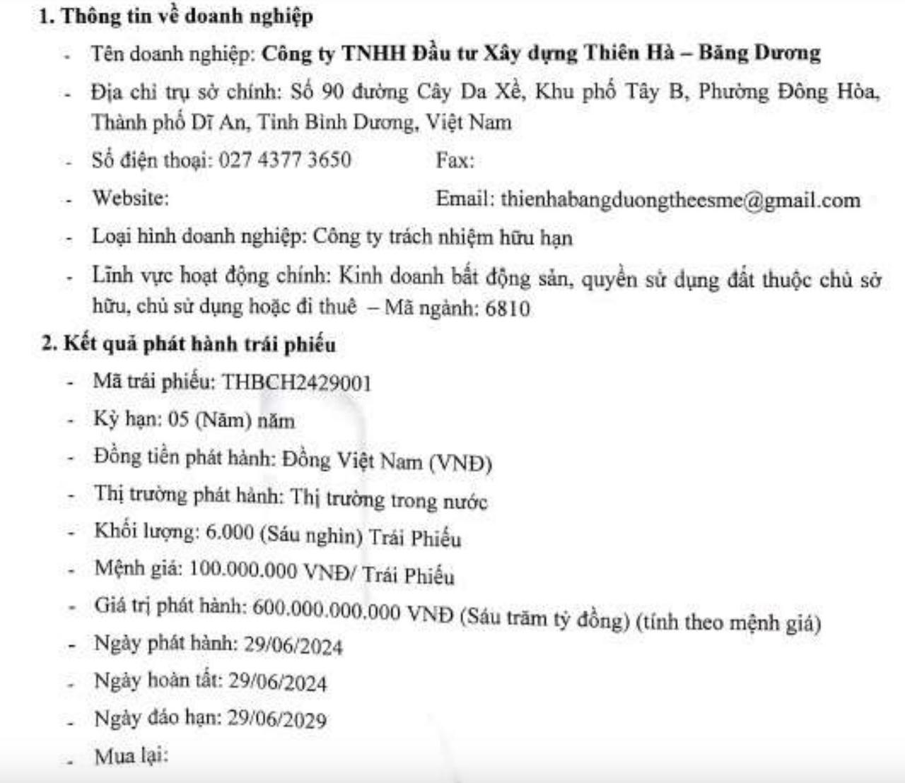 Mới đây, Công ty TNHH Đầu tư Xây dựng Thiên Hà – Băng Dương (Thiên Hà – Băng Dương) đã phát hành thành công 600 tỷ đồng trái phiếu mã THBCH2429001.