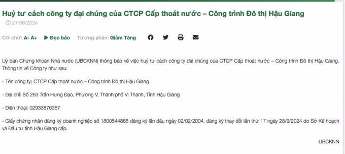 Trong thông báo, UBCKNN không nêu lý do CTCP Cấp thoát nước – Công trình Đô thị Hậu Giang bị hủy tư cách công ty đại chúng. Tuy nhiên, theo báo cáo kiểm toán năm 2023 Công ty này không còn đáp ứng điều kiện là công ty đại chúng theo quy định của Luật Chứng khoán hiện hành.
