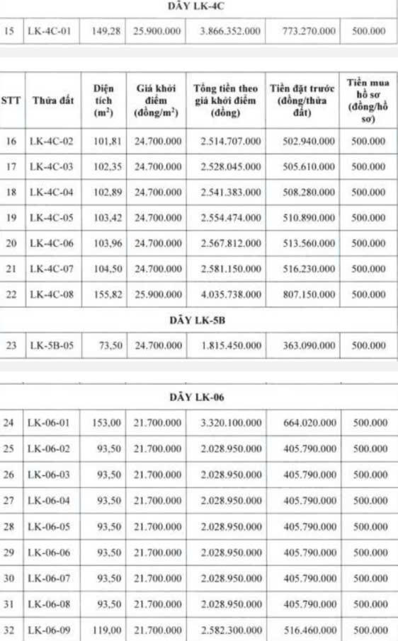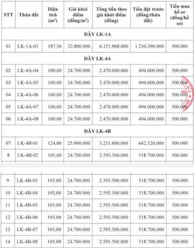 Tổng cộng có 32 thửa đất được đưa ra đấu giá, với diện tích dao động từ 73,5-187,5m2 mỗi thửa. Giá khởi điểm từ 21,7-32,8 triệu đồng/m2. Số tiền đặt trước cho mỗi thửa dao động từ hơn 405 triệu đồng đến hơn 1,23 tỷ đồng.