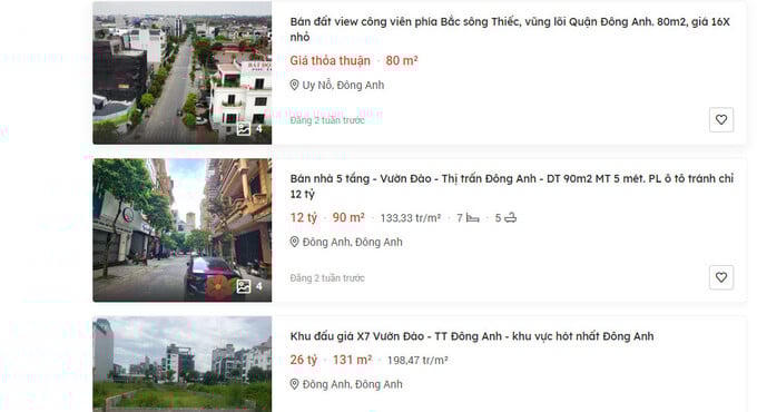 Ghi nhận trên trang Batdongsan.com, khu vực Uy Nỗ, Đông Hội, Vĩnh Ngọc... những mảnh đất nằm ở mặt đường kinh doanh đang được rao bán với giá 200-230 triệu đồng/m2. Đối với những mảnh đất nằm trong ngõ khoảng 3m, giá tại đây dao động từ 60-80 triệu đồng/m2.