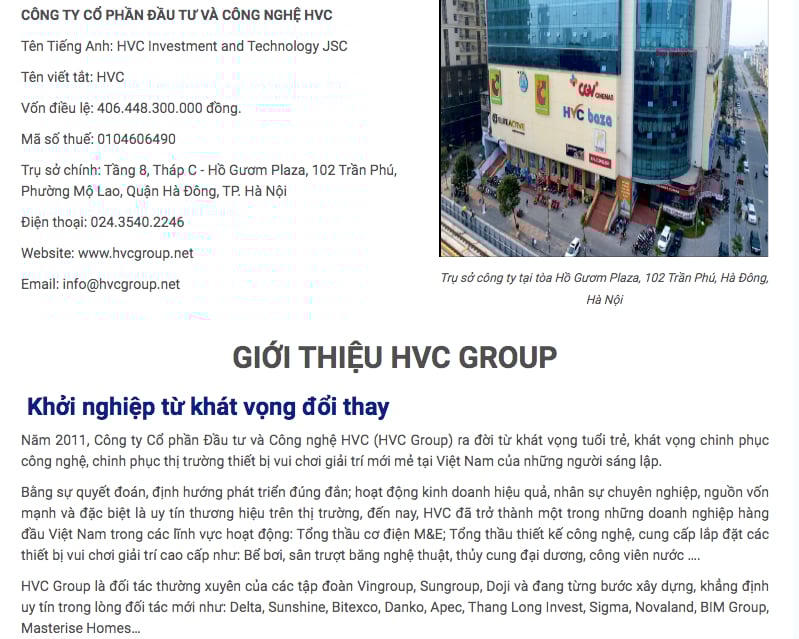 Theo tìm hiểu, HVC Group được thành lập vào năm 2011, có địa chỉ tại tầng 8, tháp C - Hồ Gươm Plaza, 102 Trần Phú, Phường Mộ Lao, Quận Hà Đông, TP. Hà Nội. Công ty có vốn điều lệ hơn 406,4 tỷ đồng. Ngày 30/11/2018, HVC Group chính thức được niêm yết tại Sở Giao dịch Chứng khoán TP. HCM, với mã chứng khoán HVH.