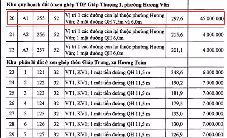 Trong bản phụ lục phê duyệt giá đất có lô A1, thửa đất 255, diện tích là hơn 297 m2 tại khu quy hoạch đất ở xen ghép tổ dân phố Giáp Thượng 1, phường Hương Văn có mức giá khởi điểm là 45 triệu đồng/m2. Trong khi các lô đất A2, A3 cạnh bên chỉ được định giá 4 triệu đồng/m2.