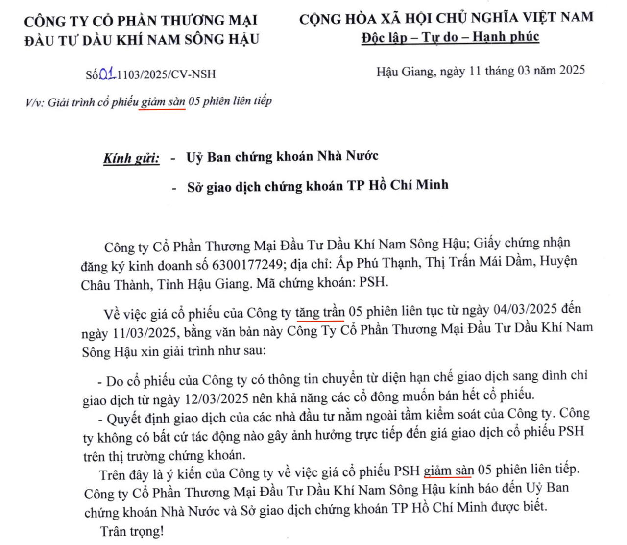 Công ty CP Thương mại Đầu tư Dầu khí Nam Sông Hậu (HoSE: PSH) vừa gặp sự cố hy hữu trong văn bản giải trình gửi Ủy ban Chứng khoán Nhà nước và Sở Giao dịch Chứng khoán TP. Hồ Chí Minh (HoSE). Thay vì lý giải nguyên nhân cổ phiếu giảm sàn 5 phiên liên tiếp như tiêu đề công văn, doanh nghiệp này lại mở đầu: “Về việc giá cổ phiếu của công ty tăng trần 5 phiên liên tục từ ngày 4/3/2025 đến ngày 11/3/2025…”.