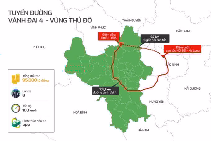 Dự án đường Vành đai 4 Vùng Thủ đô Hà Nội có tổng chiều dài 112,8km, có điểm đầu nối cao tốc Hà Nội - Lào Cai, điểm cuối nối cao tốc Nội Bài - Hạ Long. Cao tốc Vành đai 4 đi qua Hà Nội 58,2km, Hưng Yên 19,3km, Bắc Ninh 25,6km và tuyến nối theo hướng cao tốc Nội Bài - Hạ Long khoảng 9,7km; trong đó đoạn đi thấp dài 32km và đoạn đi trên cao dài hơn 80km. Dự án Vành đai 4 Vùng Thủ đô có 6 làn xe, hệ thống đường song hành hai bên, hành lang cây xanh và công trình hạ tầng kỹ thuật, đất dự trữ cho đường sắt vành đai với tốc độ thiết kế tuyến đường 100km/h.