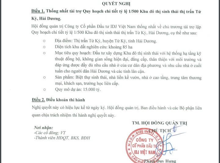 Công ty cổ phần Đầu tư IDJ Việt Nam (MCK: IDJ) vừa công bố Nghị quyết HĐQT thông qua chủ trương tài trợ lập quy hoạch chi tiết tỉ lệ 1/500 khu đô thị sinh thái thị trấn Tứ Kỳ, Hải Dương với diện tích khu đất khoảng 85ha, quy mô 15.000 tỷ đồng.