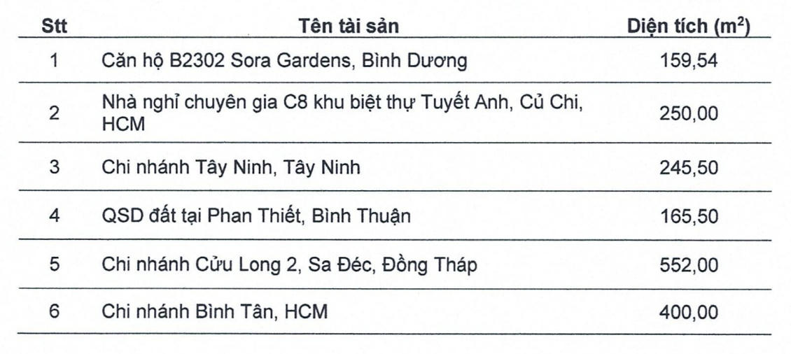 Về các tài sản không còn sử dụng, Imexpharm sẽ thanh lý tổng cộng 6 bất động sản là căn hộ B2302 Sora Gardens (Bình Dương), nhà nghỉ chuyên gia C8 khu biệt thự Tuyết Ánh (Củ Chi, TP. HCM), chi nhánh Tây Ninh, chi nhánh Cửu Long 2 (Sa Đéc, Đồng Tháp), chi nhánh Bình Tân (TP. HCM) và quyền sử dụng đất tại Phan Thiết (Bình Thuận).