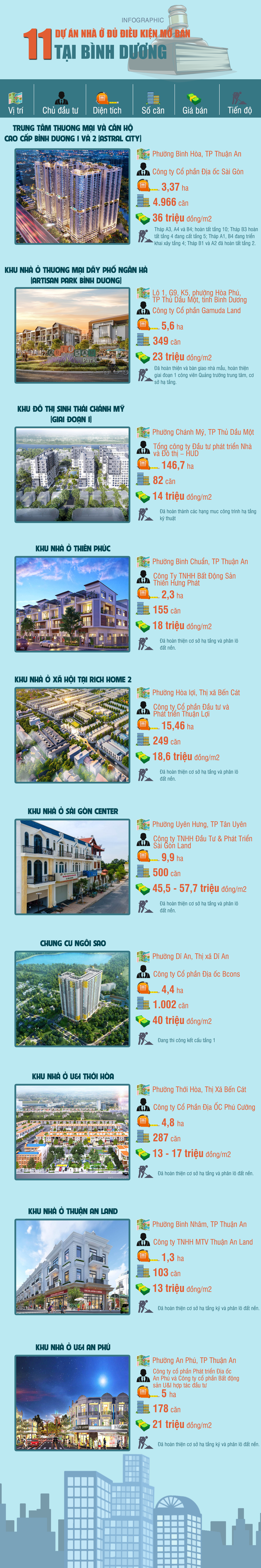 [Infographic] 11 dự án nhà ở đủ điều kiện mở bán tại Bình Dương Sở Xây dựng tỉnh Bình Dương vừa công bố danh sách 105 dự án nhà ở hình thành trong tương lai đủ điều kiện mở bán. Trong đó có 11 dự án được phê duyệt từ đầu năm đến nay. Thứ Tư 27/09/2023 16:19 (GMT+7) An Nhiên