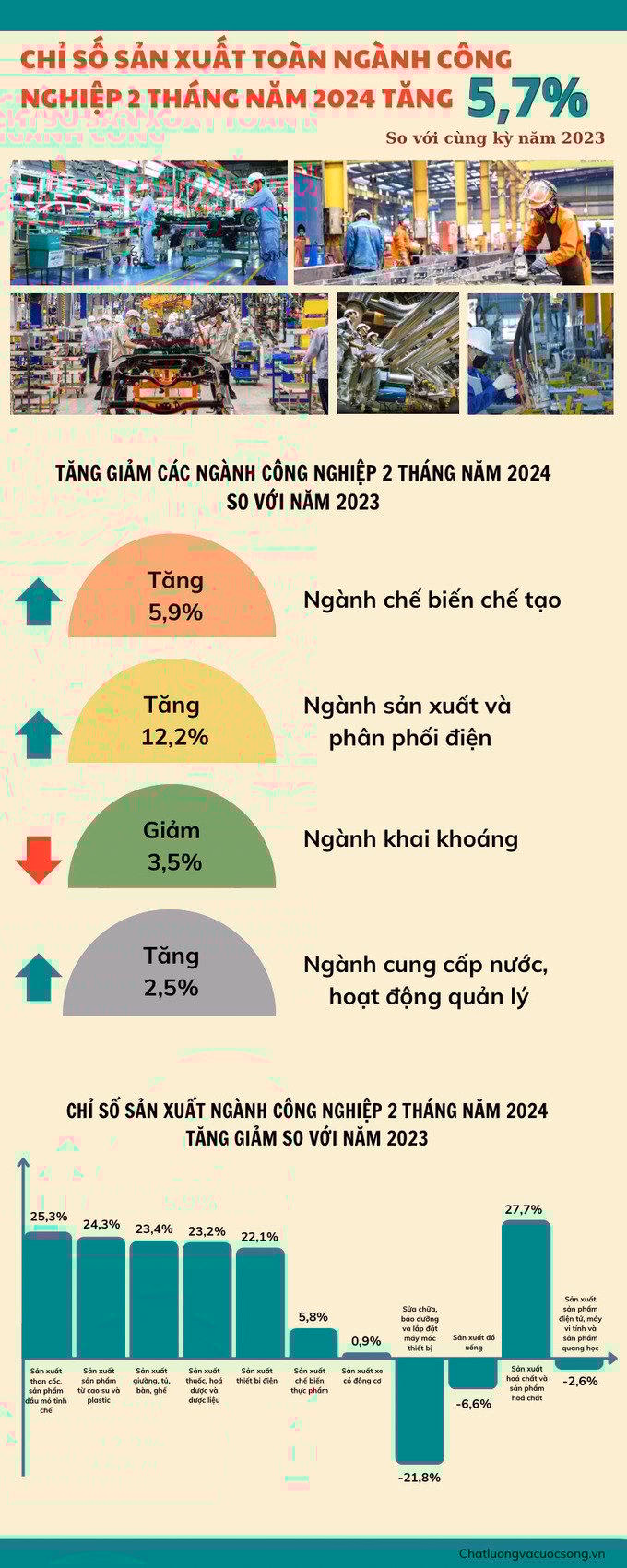 Theo báo cáo của Tổng cục Thống kê, Bộ Kế hoạch và Đầu tư, sản xuất công nghiệp tháng 02/2024 ước tính giảm 18% so với tháng trước do thời gian nghỉ Tết Nguyên đán Giáp Thìn vào trọn trong tháng 02. Tính chung 2 tháng đầu năm 2024, chỉ số sản xuất toàn ngành công nghiệp tăng 5,7% so với cùng kỳ năm trước.