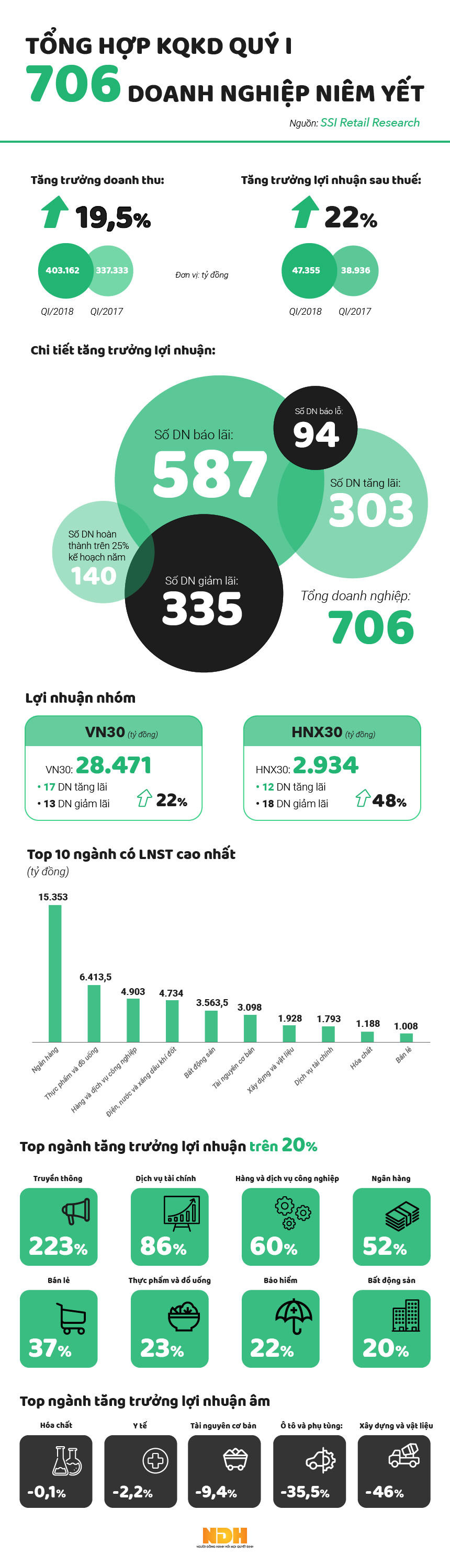 Kết thúc quý đầu năm, 706 công ty trên 2 sàn có mức tăng trưởng lợi nhuận 22% so với cùng kỳ năm trước, theo số liệu thống kê từ bộ phận phân tích khách hàng cá nhân CTCP Chứng khoán Sài Gòn (SSI Retail Research).