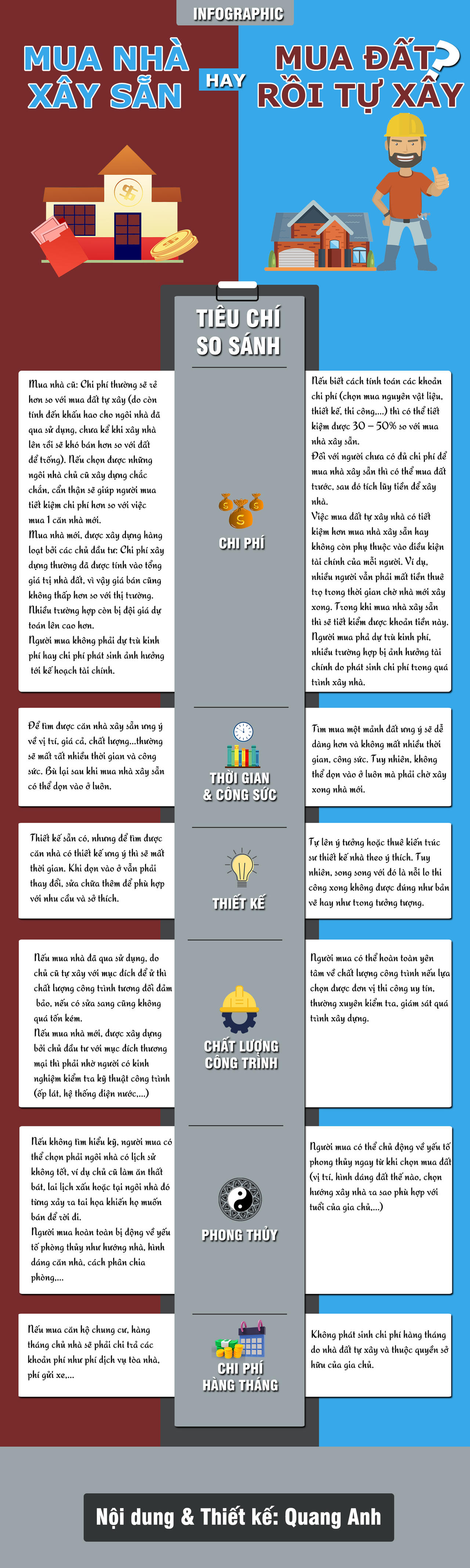 Khi đã có một khoản tiền tích cóp và mong muốn tìm chốn an cư, đặc biệt là với những cặp vợ chồng trẻ. Tuy nhiên lựa chọn nên mua nhà xây sẵn hay mua đất rồi tự xây lại là vấn đề được đặt ra. Infographic dưới đây sẽ chỉ ra những ưu, nhược điểm của từng phương án, giúp bạn đưa ra quyết định phù hợp.
