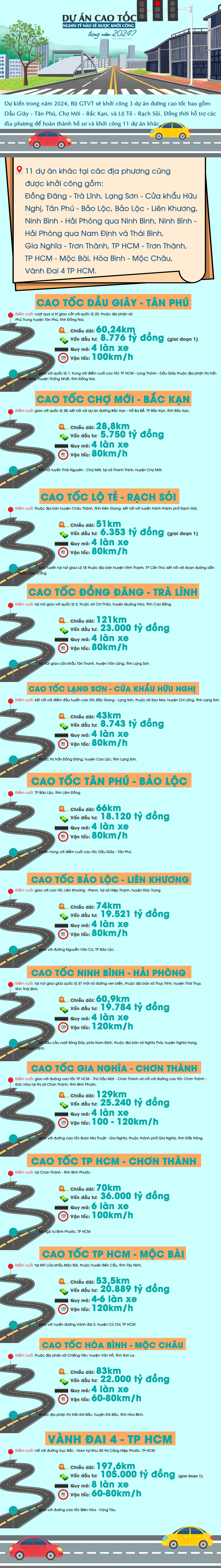 Dự kiến trong năm 2024, Bộ GTVT sẽ khởi công 3 dự án đường bộ cao tốc gồm Dầu Giây - Tân Phú, Chợ Mới - Bắc Kạn và Lộ Tẻ - Rạch Sỏi. Đồng thời, hỗ trợ các địa phương hoàn thành hồ sơ để khởi công 11 dự án khác.