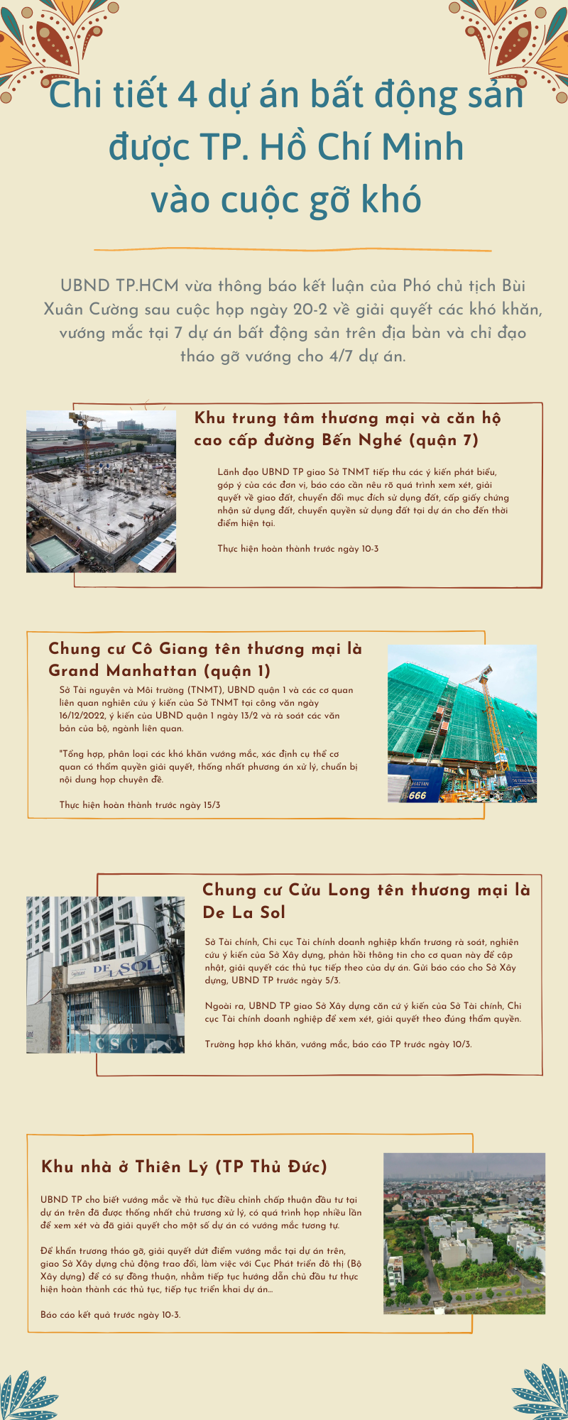 UBND TP Hồ Chí Minh vừa thông báo kết luận của Phó chủ tịch Bùi Xuân Cường sau cuộc họp ngày 20-2 về giải quyết các khó khăn, vướng mắc tại 7 dự án bất động sản trên địa bàn và chỉ đạo tháo gỡ vướng cho 4/7 dự án. Phó Chủ tịch UBND TP Hồ Chí Minh đã chỉ đạo rõ các phần việc với các sở, ngành để gỡ vướng cho 4 dự án Bất động sản lớn ngay trong tháng 3.