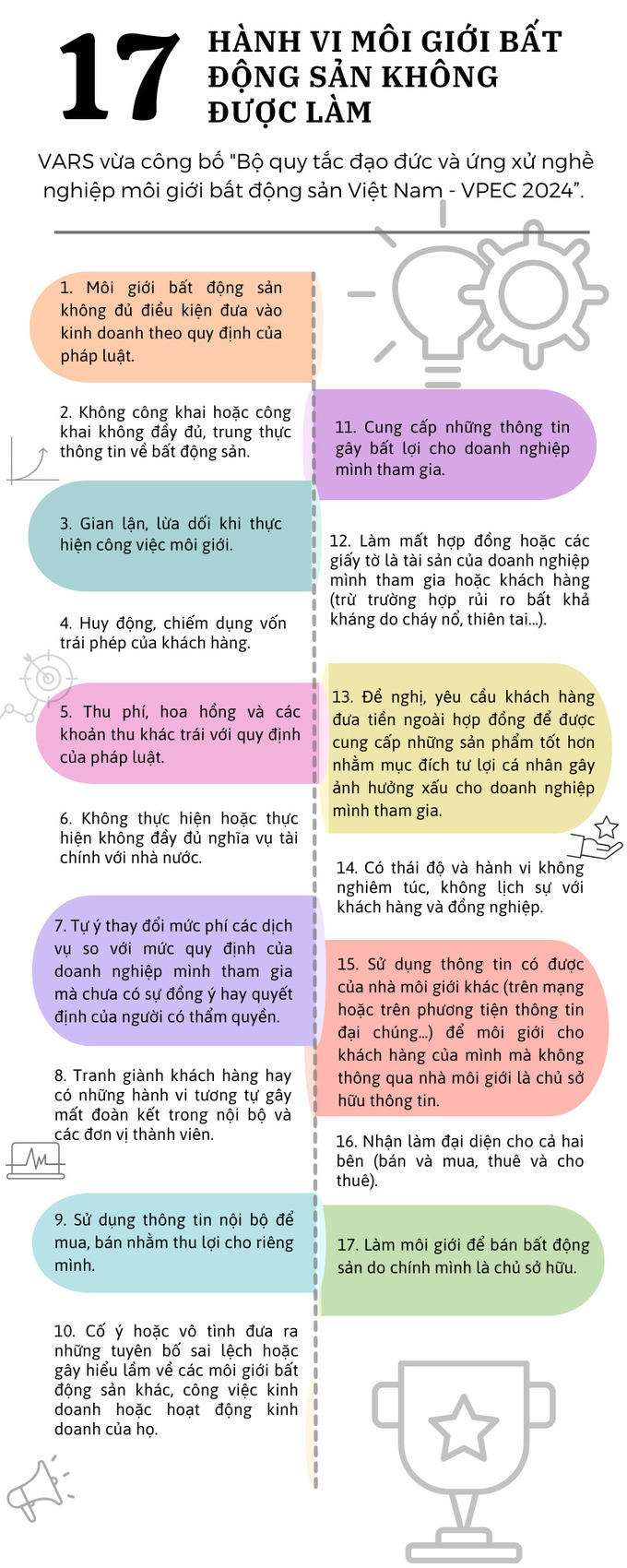 Hội Môi giới bất động sản Việt Nam (VARS) vừa công bố "Bộ quy tắc đạo đức và ứng xử nghề nghiệp môi giới bất động sản Việt Nam - VPEC 2024”. Trong đó quy định 17 hành vi nhà môi giới không được làm.