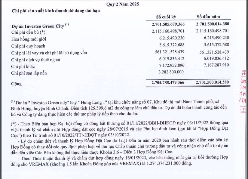Công ty ghi nhận. chi phí đền bù của dự án là gần 2.115,2 tỷ đồng; chi phí lãi vay và chi phí lãi sử dụng vốn là hơn 561,3 tỷ đồng.