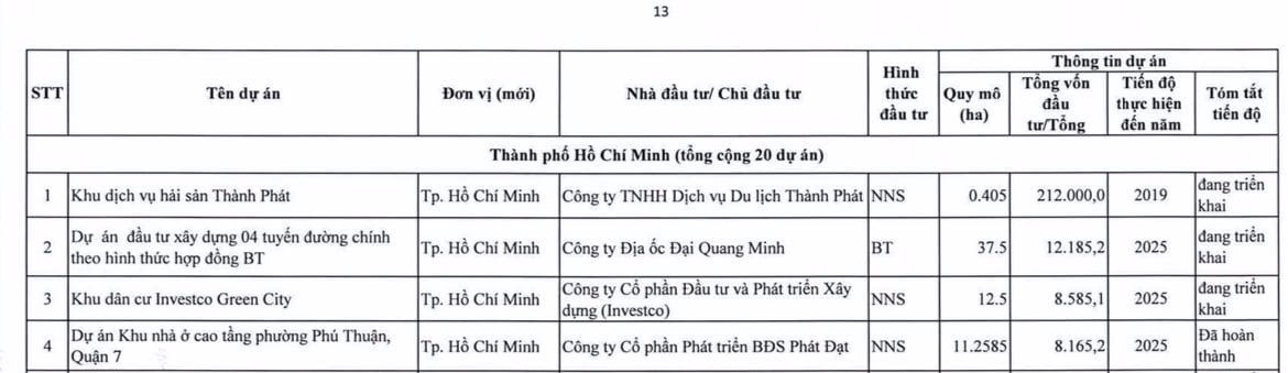 Tại TP. HCM, Thanh tra Chính phủ sẽ trực tiếp thanh tra 20 dự án. Trong đó đề cập tới dự án Khu dân cư Investco Green City do Công ty cổ phần Đầu tư và phát triển Xây dựng (INVESTCO) làm chủ đầu tư. Dự án có quy mô 12,5ha và có tổng mức đầu tư hơn 8.585 tỷ đồng.