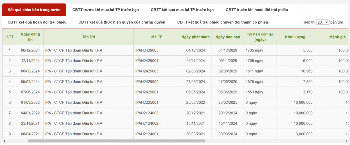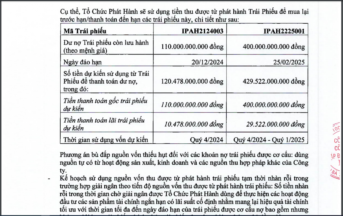 Ở chiều ngược lại, vào ngày 4/12/2024, IPA đã phát hành một lô trái phiếu mới mang mã IPAH2429005, gồm 5.500 trái phiếu loại không chuyển đổi, không kèm chứng quyền và không có đảm bảo. Mệnh giá mỗi trái phiếu là 100 triệu đồng, tổng giá trị phát hành đạt 550 tỷ đồng, kỳ hạn 5 năm và lãi suất danh nghĩa cố định 9,5%/năm.