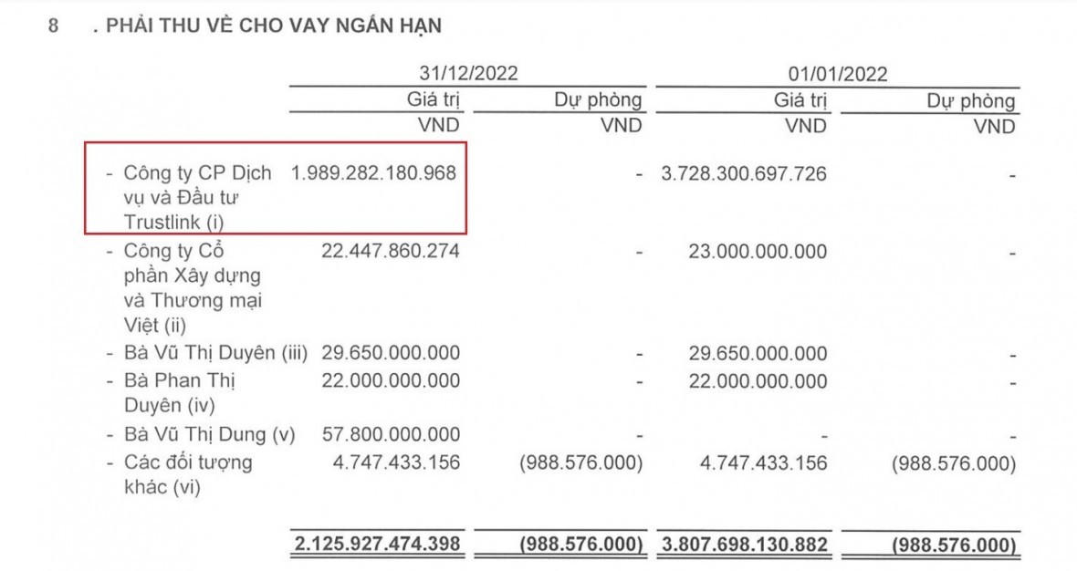 Theo ghi nhận trên báo cáo tài chính của IPA còn cho thấy, tại thời điểm đầu năm 2022, khoản vay của Trustlink tại IPA thậm trí còn lên đến 3.728 tỷ đồng. Đến cuối năm, con số này đã giảm nhưng vẫn còn gần 2.000 tỷ đồng.