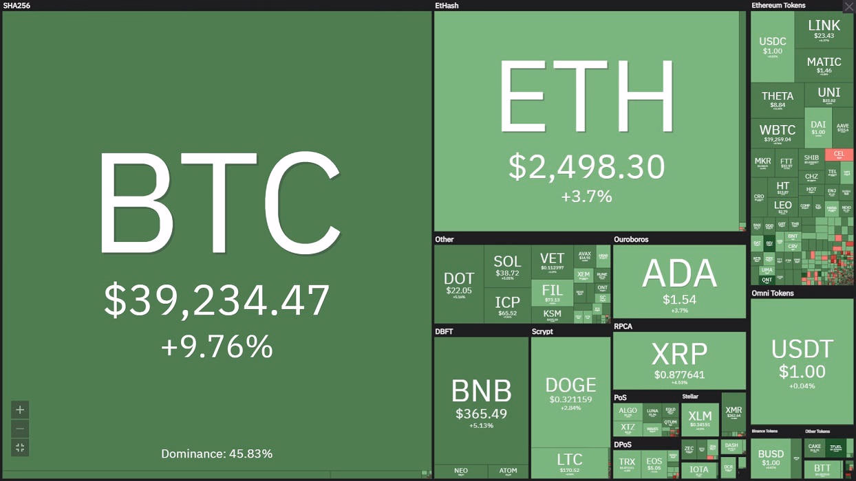 Trong phiên vừa qua, sau ngày dài “lặng sóng” dưới khu vực 35.000 USD, giá Bitcoin đã rục rịch di chuyển lên gần 40.000 USD và đáng mừng hơn nữa, sự trở lại này có vẻ rất tích cực. Sắc xanh phủ đầy thị trường, nhiều đồng đạt hai chữ số tăng trưởng trong 24 giờ qua. Trên biểu đồ diễn biến 7 ngày của hầu hết các đồng tiền số trên bảng xếp hạng đều đang vươn lên mạnh mẽ. Theo cập nhật từ Coindesk, giá BTC hôm nay (14/6) ghi nhận được vào thời điểm 8h47 ở mức 39.222 USD, tăng 9,68% so với 24 giờ qua.