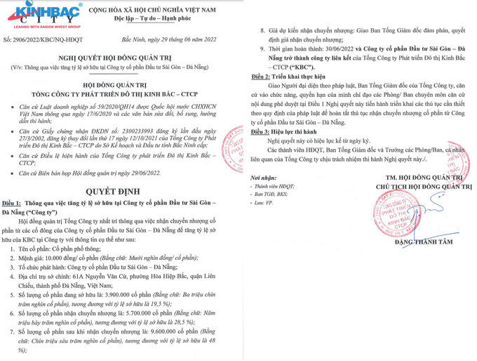 Nghị quyết HĐQT Đô thị Kinh Bắc (HoSE: KBC) thông qua việc mua thêm 5,7 triệu cổ phần của CTCP Đầu tư Sài Gòn - Đà Nẵng để nâng sở hữu từ 3,9 triệu cổ phần (chiếm 19,5% vốn) lên 9,6 triệu cổ phần (chiếm 48% vốn). Sau giao dịch, Kinh Bắc sẽ biến CTCP Đầu tư Sài Gòn - Đà Nẵng trở thành công ty liên kết. Giá chuyển nhượng được giao cho Ban Tổng giám đốc đàm phán, quyết định.