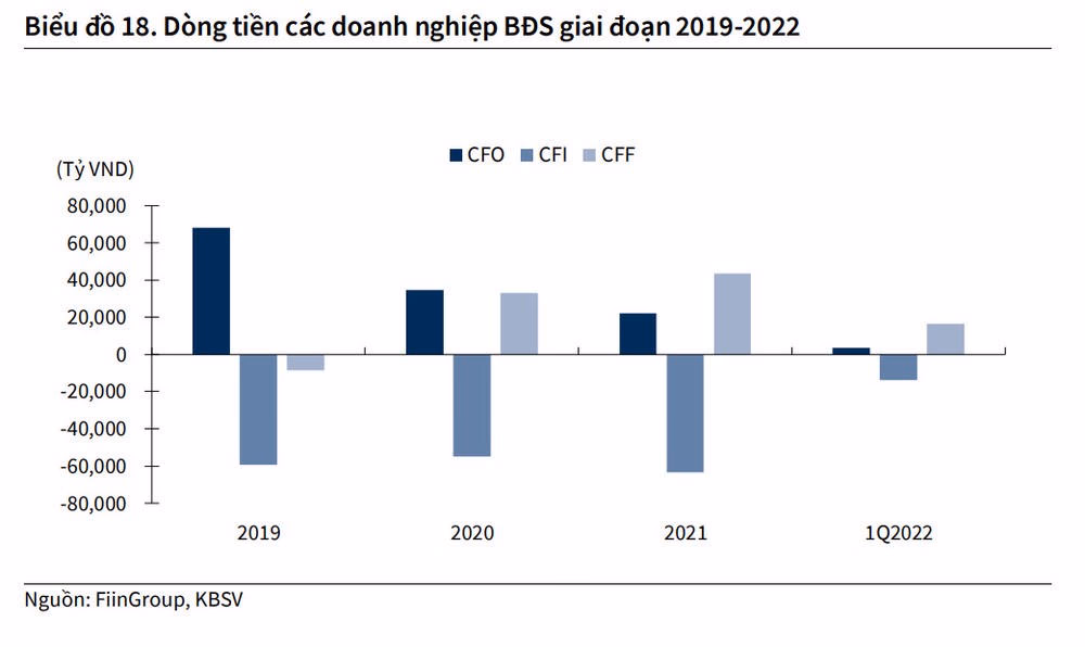 KBSV đã đưa ra nhận định, đối với nhóm doanh nghiệp bất động sản quy mô vốn hoá dưới 20.000 tỷ đồng tiềm ẩn nhiều rủi ro. Theo đó, giai đoạn 2021 – 2021 ghi nhận nhóm này có dòng tiền thuần từ hoạt động kinh doanh (CFO) dương không ấn tượng, riêng nhóm có vốn chủ sở hữu từ 1.000- 5.000 tỷ đồng thì CFO âm giai đoạn 2021 – quý I/2022. Bên cạnh đó, nhóm này cũng đẩy mạnh hoạt động đầu tư, mua dự án mới giá trị lớn bằng dòng vốn vay nợ cũng như phát hành cổ phiếu.