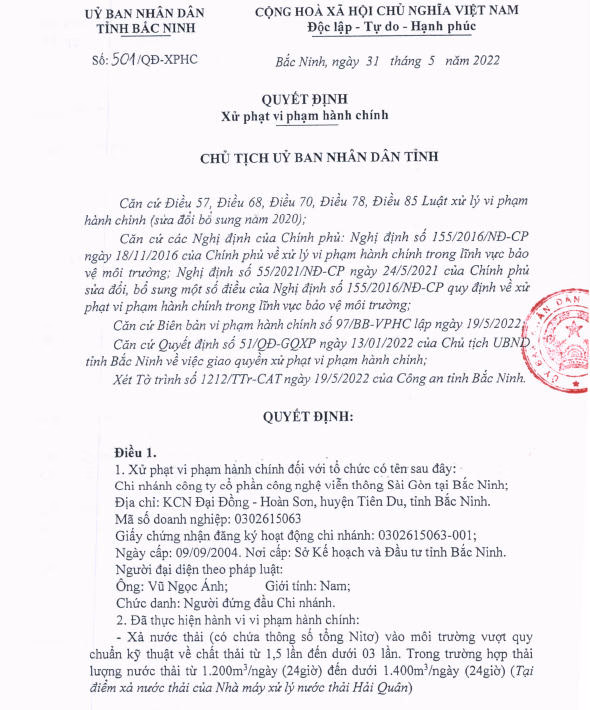 UBND tỉnh Bắc Ninh quyết định xử phạt đối với Công ty CP Công nghệ viễn thông Sài Gòn vi phạm về xả nước thải vượt quy chuẩn kỹ thuật.