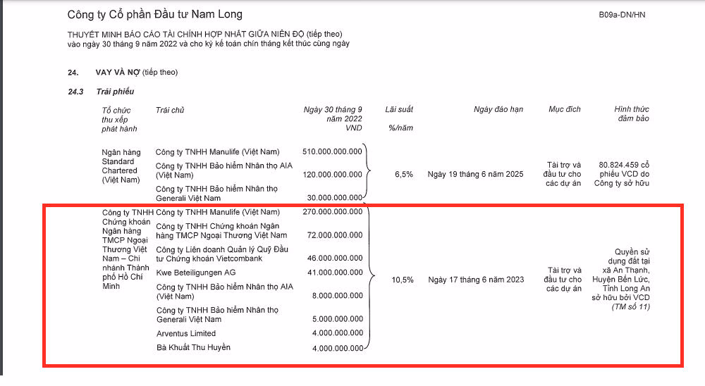 Đáng chú ý, nếu hoàn tất phát hành trái phiếu đợt này, nợ phải trả tại Nam Long sẽ được nâng lên vượt mức 13.000 tỷ đồng. Cụ thể, tính đến cuối quý 3, dư nợ tài chính của Nam Long đạt 4.595 tỷ đồng, tăng 27% so với đầu năm và chiếm 18% trong tổng nguồn vốn. Nợ trái phiếu là 2.517 tỷ đồng, tăng 25% so với đầu năm. Nếu hoàn thành đợt phát hành trái phiếu vừa công bố ở trên, dư nợ trái phiếu của công ty sẽ vượt mức 3.000 tỷ đồng. Trong đó, gần nhất là khoản nợ 450 tỷ đồng trái phiếu sẽ đáo hạn trong tháng 6/2023 tới đây.