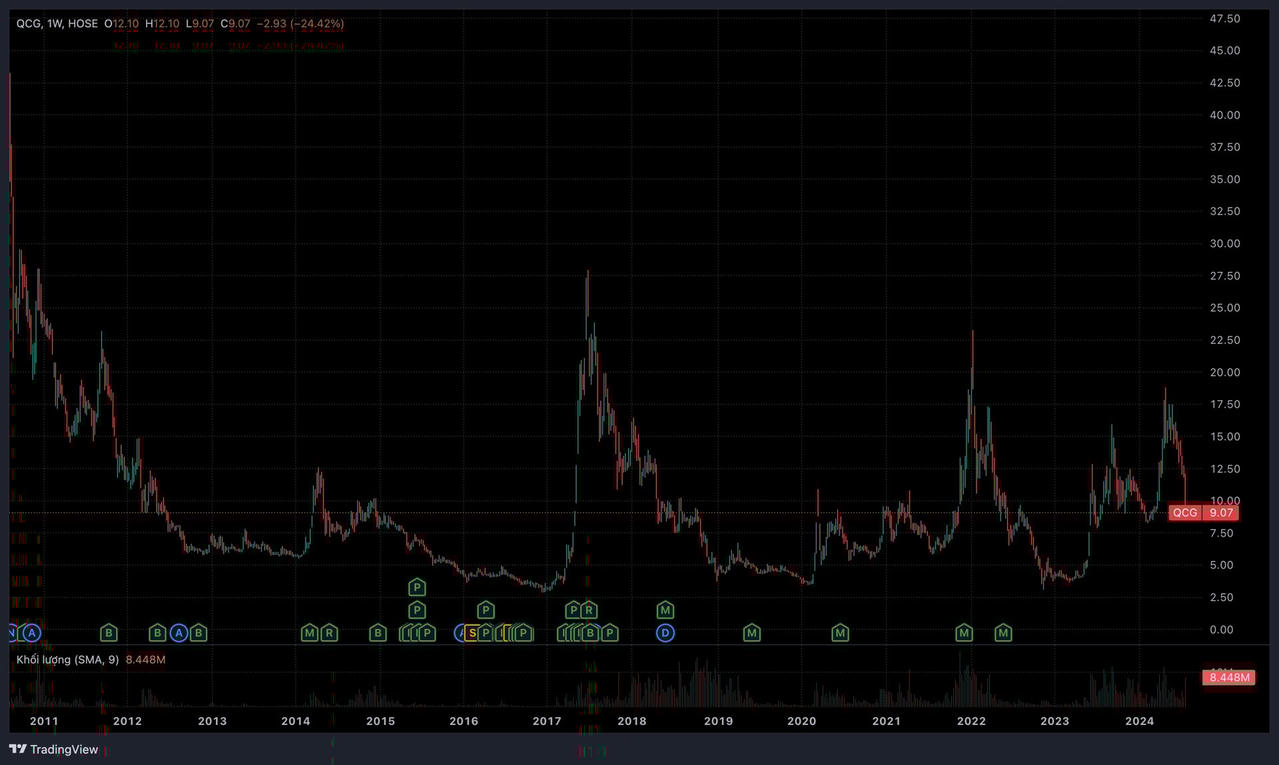 Từ vùng đáy ngắn hạn 8.250 đồng/cp ghi nhận vào tháng 2/2024, chỉ trong vòng 2 tháng, cổ phiếu QCG đã tăng tới 128%, qua đó lập đỉnh tại mức 18.800 đồng/cp vào tháng 4. Tuy nhiên, tương tự những diễn biến trước đó, mã này bắt đầu vẽ chiều xuống của cây thông khi sụt giảm tới hơn 50%, đưa nhà đầu tư vào cảnh "đón Noel sớm".