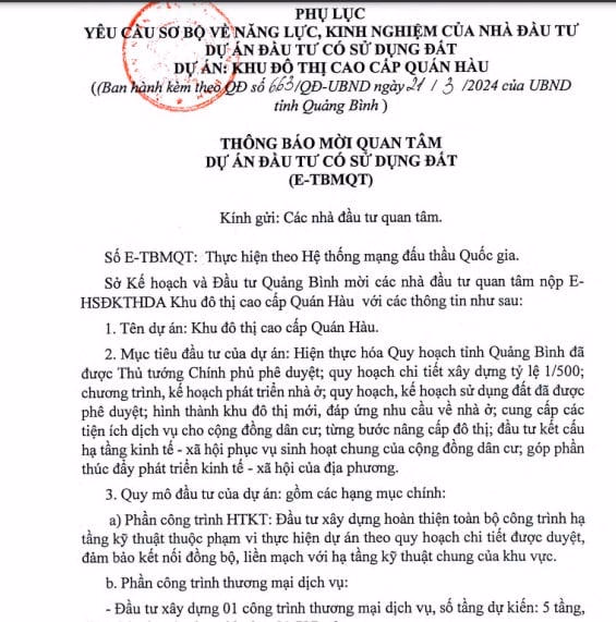 Sở Kế hoạch và Đầu tư tỉnh Quảng Bình vừa phát thông báo về việc mời các nhà đầu tư quan tâm nộp hồ sơ đăng ký thực hiện dự án Khu đô thị cao cấp Quán Hàu giữa dòng sông Nhật Lệ.