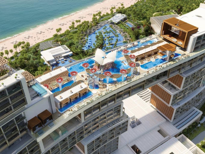 Cũng tại tầng 22, căn hộ siêu VIP từng được siêu mẫu Kendall Jenner thuê để tổ chức tiệc ra mắt thương hiệu cá nhân, nổi bật với hồ bơi sang trọng, hai khu vực tiếp khách và bồn ngâm đáy kính. Trong các biệt thự và dãy phòng đặc trưng của khu nghỉ dưỡng, du khách có thể sử dụng hồ bơi trên sân hiên riêng, cao đến tầng 43.