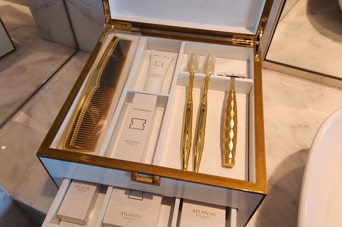 Một trong những điểm thu hút khách tại Atlantis là "vàng". Tiện nghi trong 759 phòng được thiết kế riêng bởi hãng kim cương nổi tiếng Graff. Áo choàng tắm đến từ thương hiệu dệt may sang trọng Frette của Ý và bàn chải đánh răng, lược, dao cạo đều được thiết kế bằng vàng. Spa rộng 3.000 m2 cung cấp dịch vụ chăm sóc da mặt bằng vàng, massage với đá núi lửa nhúng vàng và dầu thơm tẩm vàng để trị liệu cho du khách.