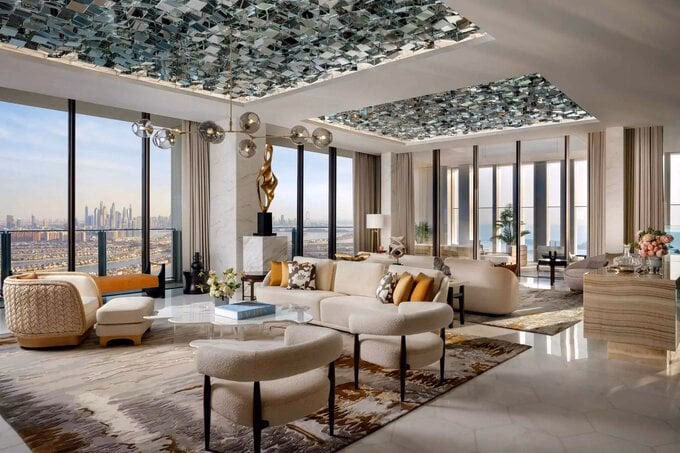 Khách đặt phòng này sẽ được đưa đón miễn phí tại sân bay và có sẵn các sản phẩm từ các thương hiệu nổi tiếng như Graff, Valentino. Các đầu bếp nổi tiếng từ các nhà hàng trong khách sạn sẽ nấu ăn trong căn bếp riêng của khách, cùng với dịch vụ quản gia và nhân viên pha chế sẵn sàng phục vụ theo yêu cầu của khách suốt 24/7.