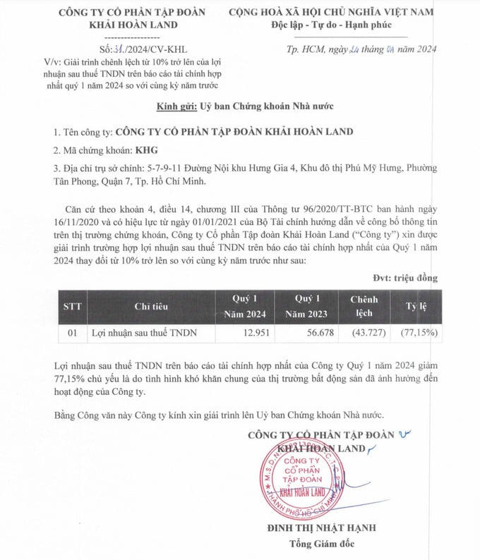 Bà Đinh Thị Nhật Hạnh - Tổng giám đốc Công ty Cổ phần Tập đoàn Khải Hoàn Land (gọi tắt là Khải Hoàn Land), trụ sở chính tại số 5 - 7- 9 - 11 Đường nội khu Hưng Gia 4, Khu đô thị Phú Mỹ Hưng, phường Tân Phong, quận 7, Tp.HCM, đã ký văn bản giải trình số 31/2024/CV-KHL gửi Ủy ban Chứng khoán Nhà nước về chệnh lệch 10% trở lên của lợi nhuận sau thuế thu nhập doanh nghiệp (viết tắt là TNDN) trên báo cáo tài chính hợp nhất quý I/2024 so với cùng kỳ năm trước.