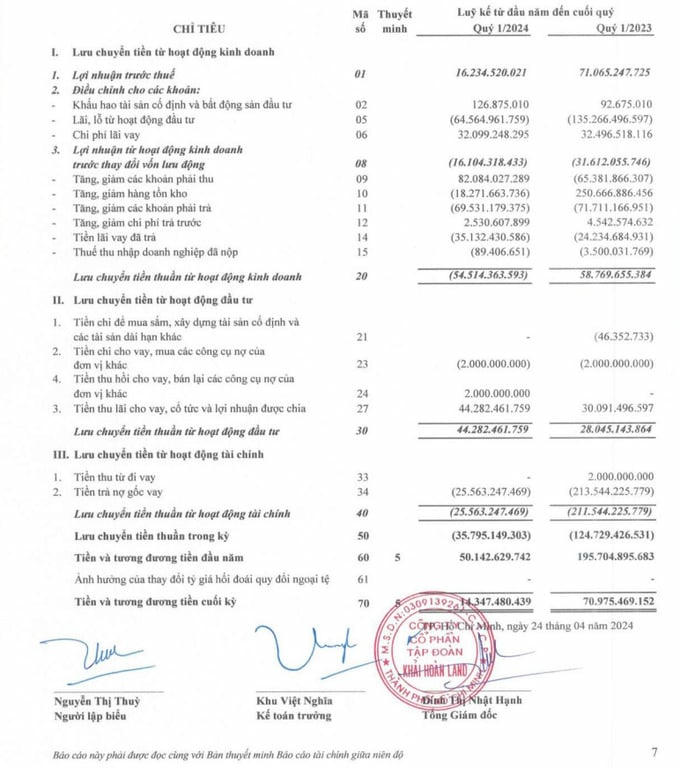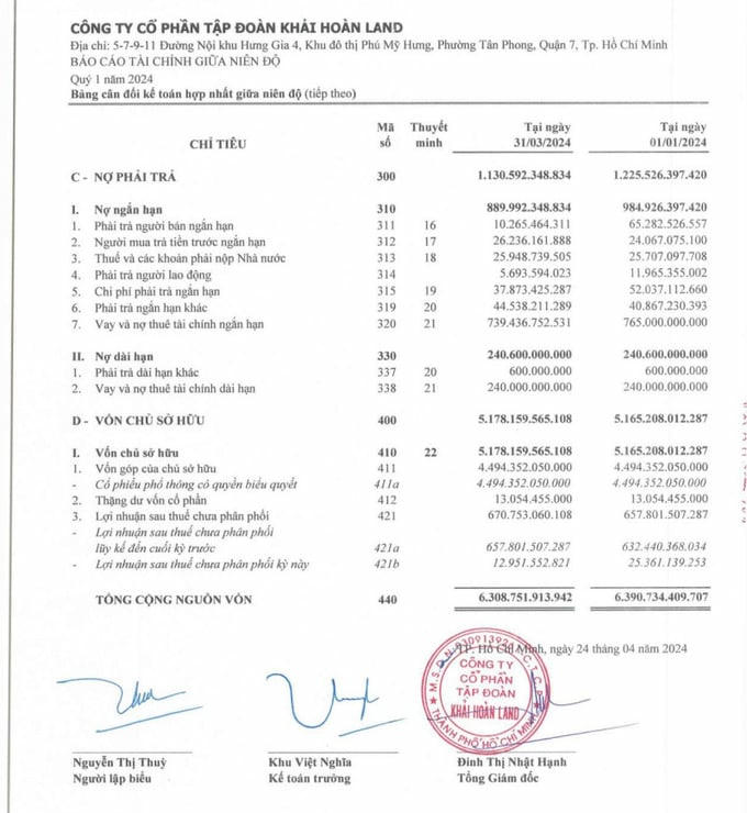 Bên cạnh đó, tính đến ngày 31/3/2024 nợ phải trả của Khải Hoàn Landđã giảm được 7,7% so với đầu năm.