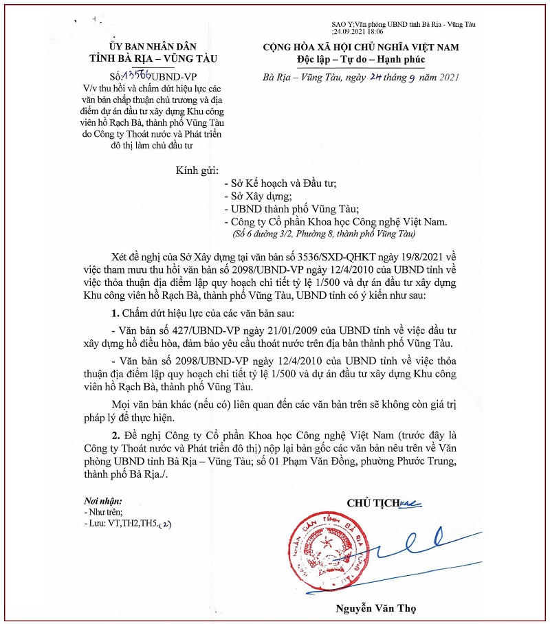 Đồng thời, tỉnh cũng chấm dứt hiệu lực Văn bản số 2098/UBND-VP ngày 12/4/2010 của UBND tỉnh về việc thỏa thuận địa điểm lập quy hoạch chi tiết tỷ lệ 1/500 và dự án đầu tư xây dựng khu công viên hồ Rạch Bà.
