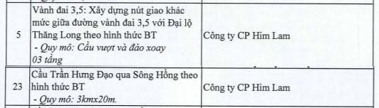 Ngoài dự án trên, hai dự án mới nhất bị của Him Lam bị Hà Nội “khai tử” gồm: Dự án Vành đai 3,5 và dự án Cầu Trần Hưng Đạo qua Sông Hồng.