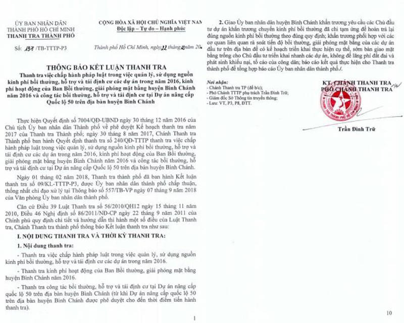 Thanh tra TP.HCM vừa công khai kết luận thanh tra về việc chấp hành pháp luật trong việc quản lý, sử dụng nguồn kinh phí bồi thường, hỗ trợ và tái định cư các dự án trong năm 2016, kinh phí hoạt động của Ban bồi thường, giải phóng mặt bằng huyện Bình Chánh năm 2016 và công tác bồi thường, hỗ trợ và tái định cư tại dự án nâng cấp quốc lộ 50 tại huyện Bình Chánh.